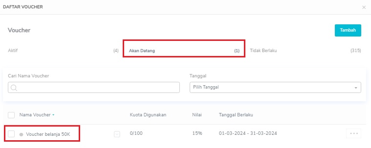 3. Untuk mulai membuat voucher baru, silakan klik Tambah: