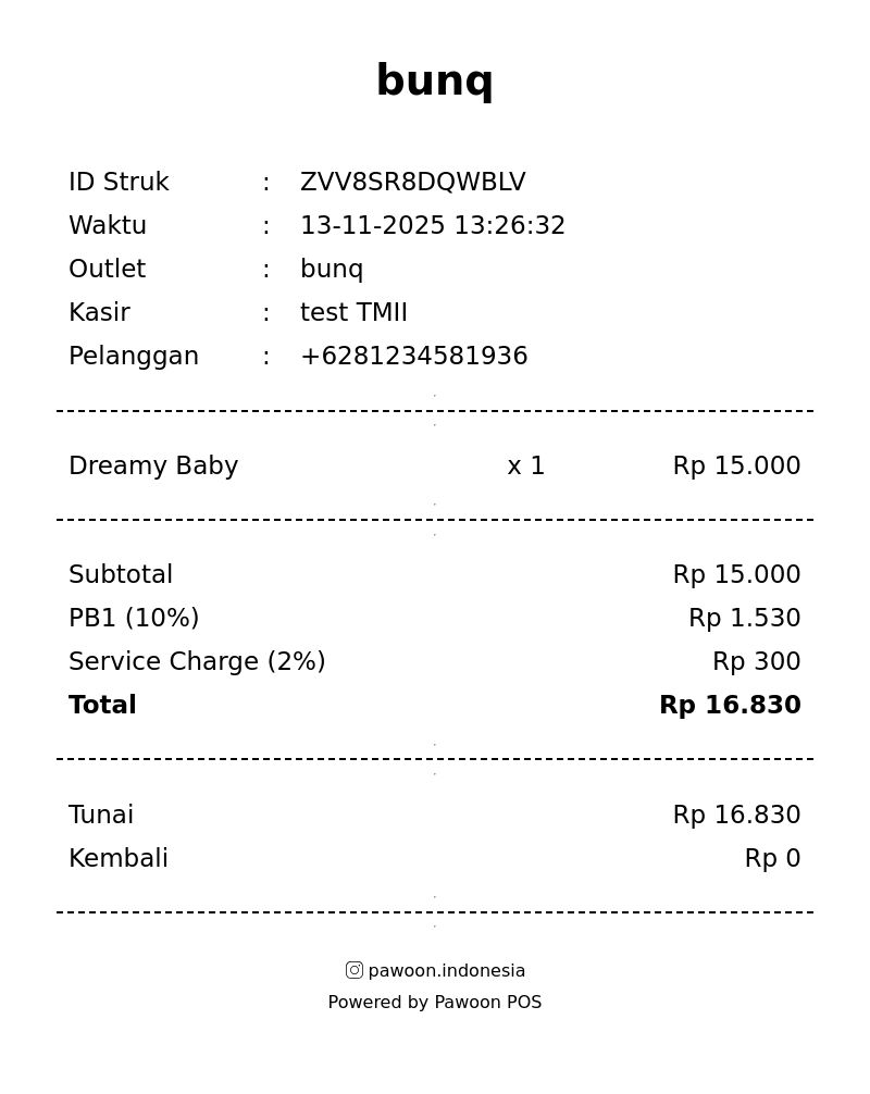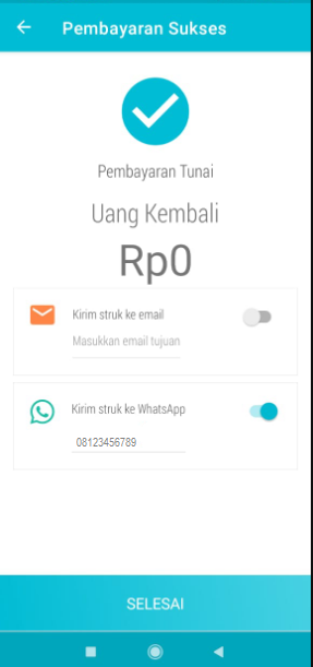 Dan pelanggan akan menerima struk pada nomor Whatsapp yang telah diinput sebelumnya. Berikut contoh tampilan struk yang dikirimkan ke Whatsapp pelanggan: